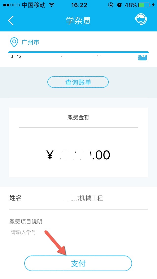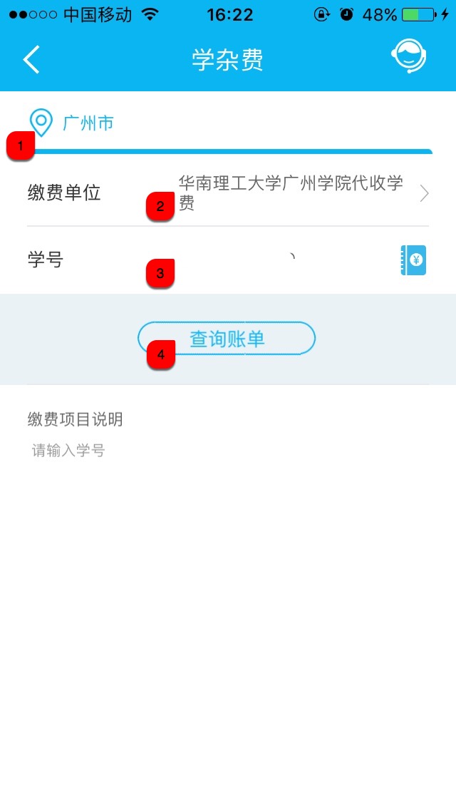 4、首先确认地区为「广州市」,然后依次选择「缴费单位」、输入「学号」,然后点击查询