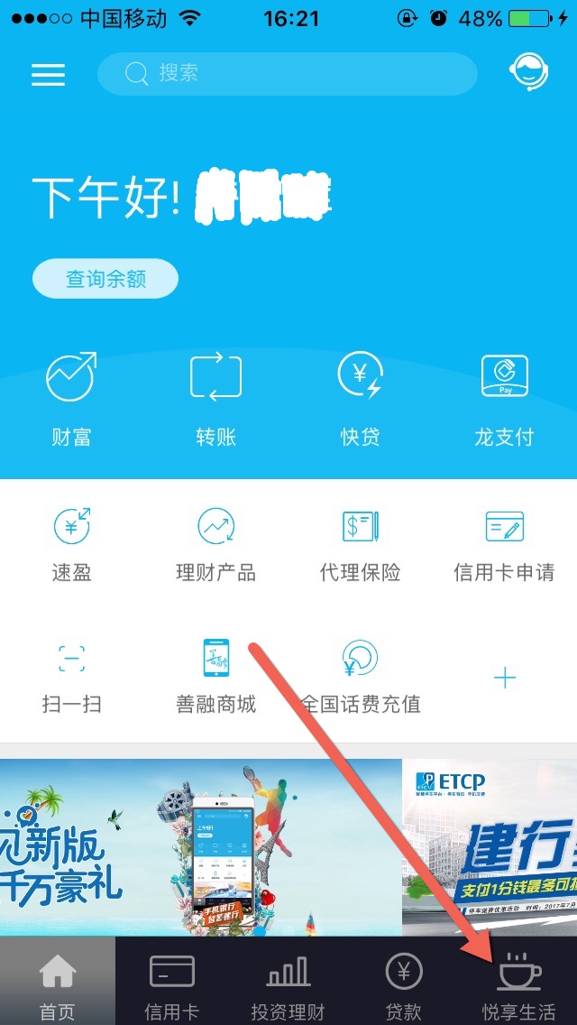 1、首先,安装并打开「中国建设银行」App,从底部菜单进入「悦享生活」