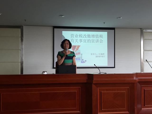 宣讲会由财务处高霞副处长主持,由财务处会计科科长江婉萍主讲。宣讲内容分为四部分,第一部分为视频导览。会议伊始,江科长向大家播放了一段税务局精心制作的宣传视频,由此引题展开了对“营改增”的讲解以及我校相关工作的介绍。