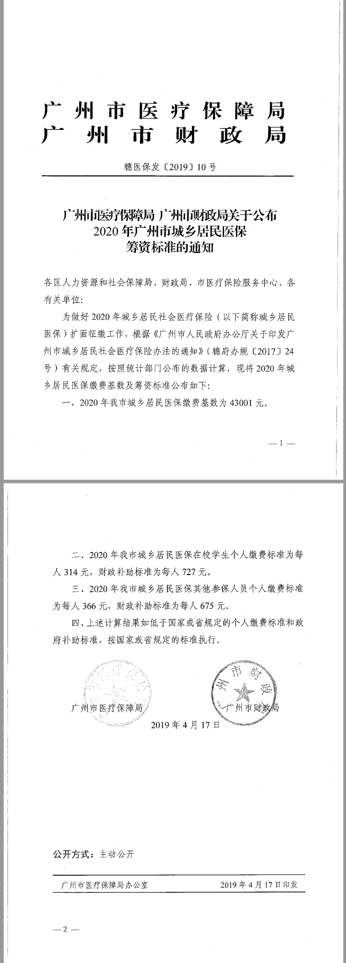 广州市财政局关于公布2020年广州市城乡居民医保筹资标准的通知