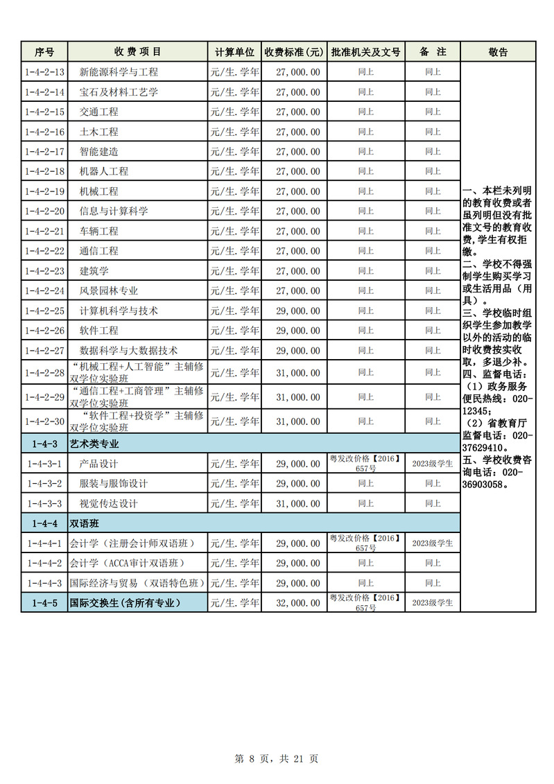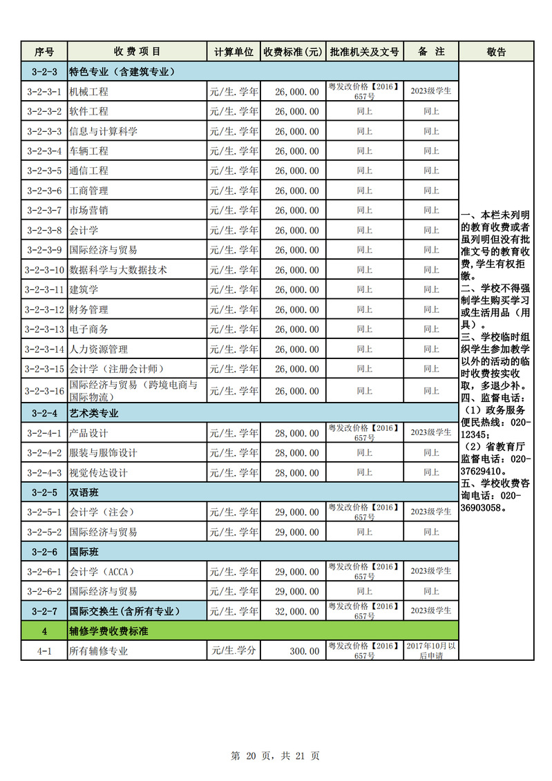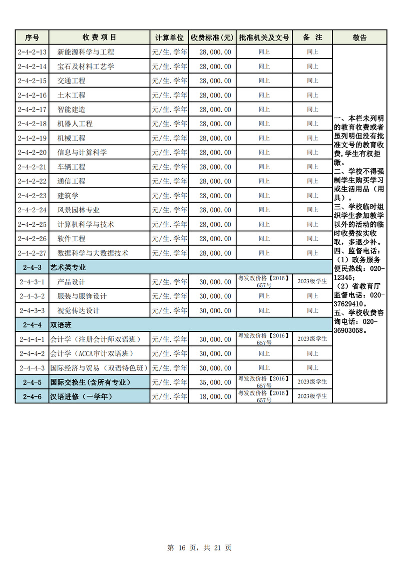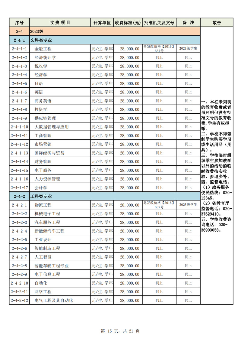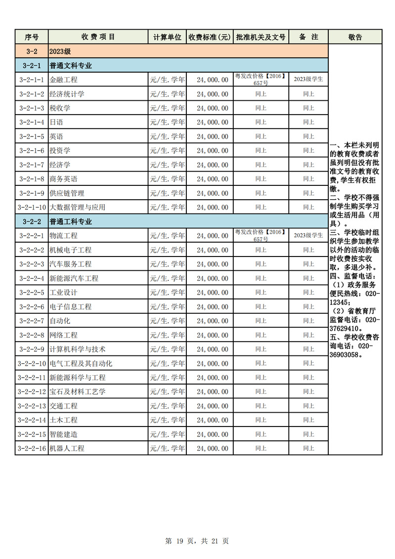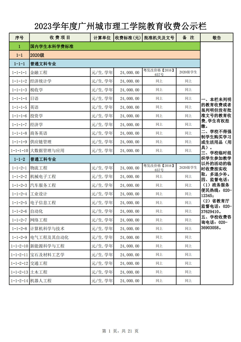 2023学年度广州城市理工学院教育收费公示栏