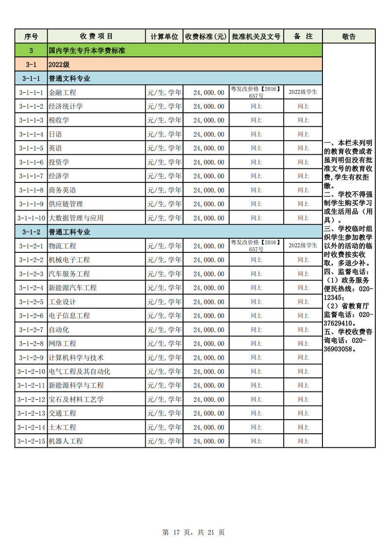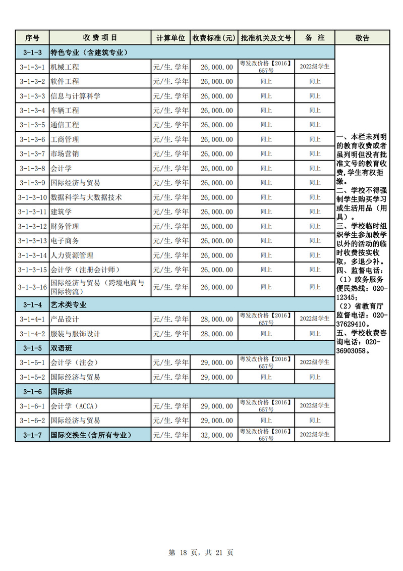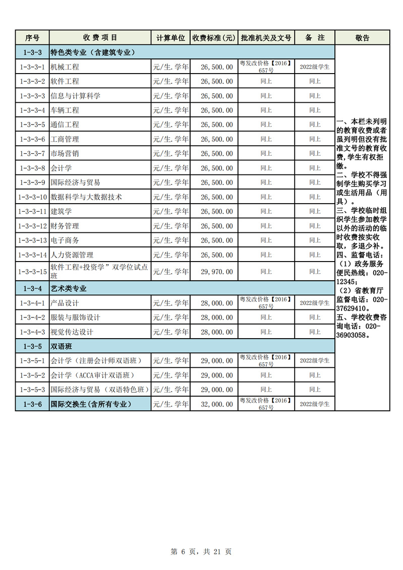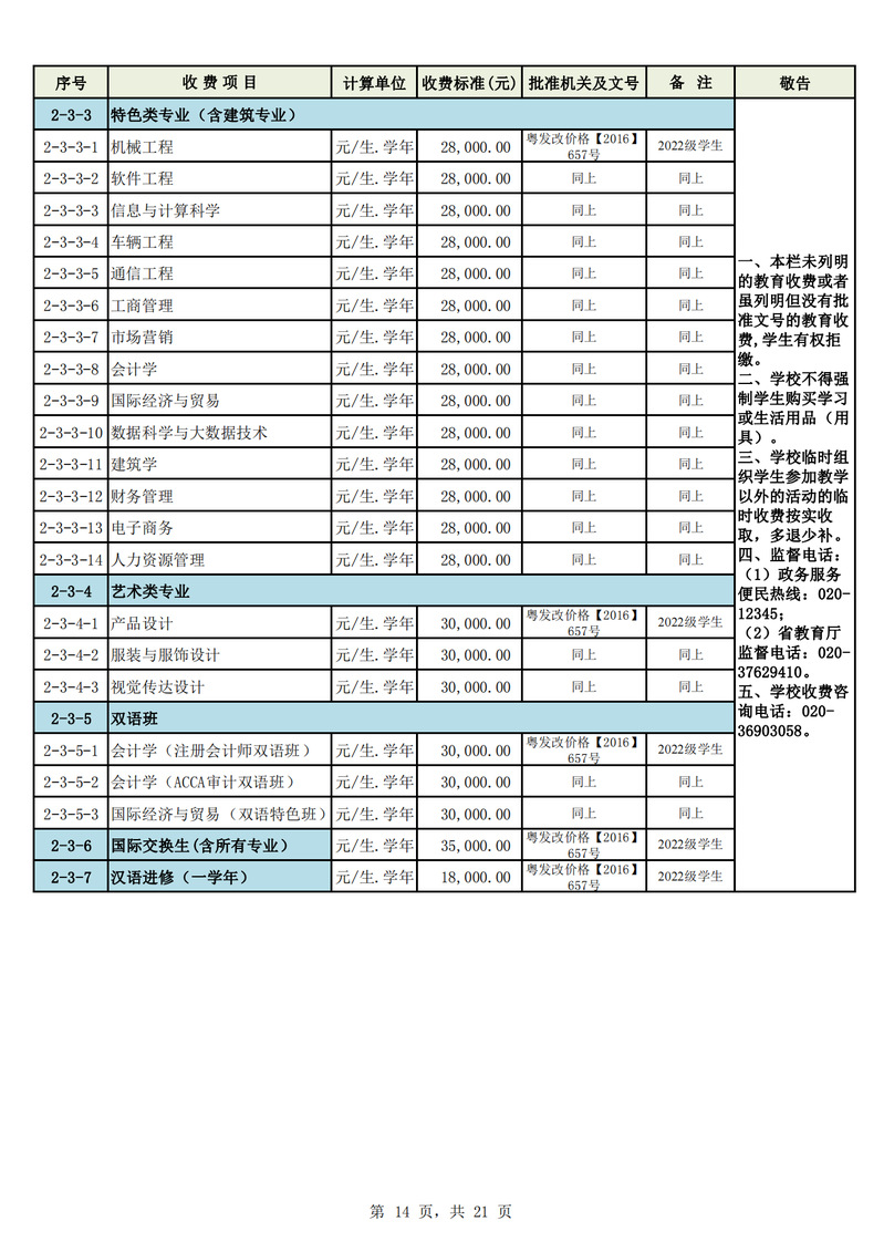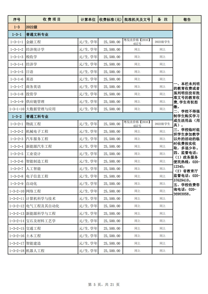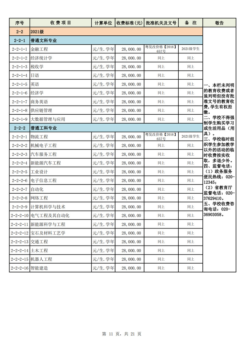 2023学年度广州城市理工学院教育收费公示栏