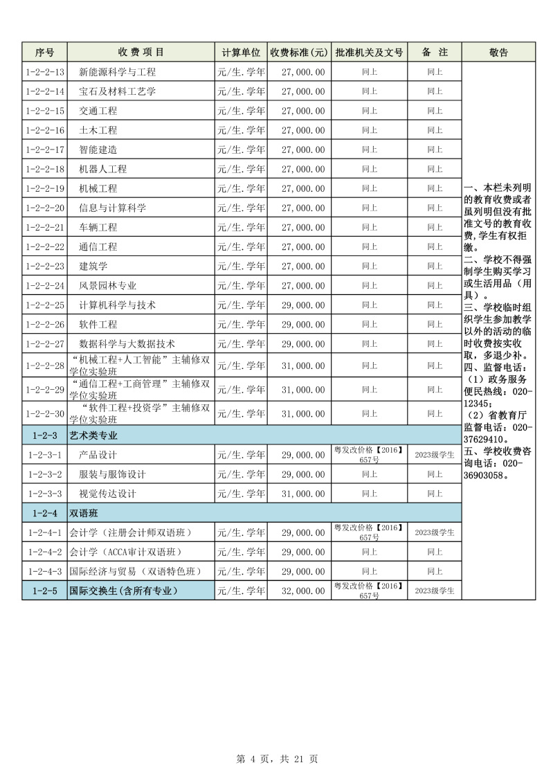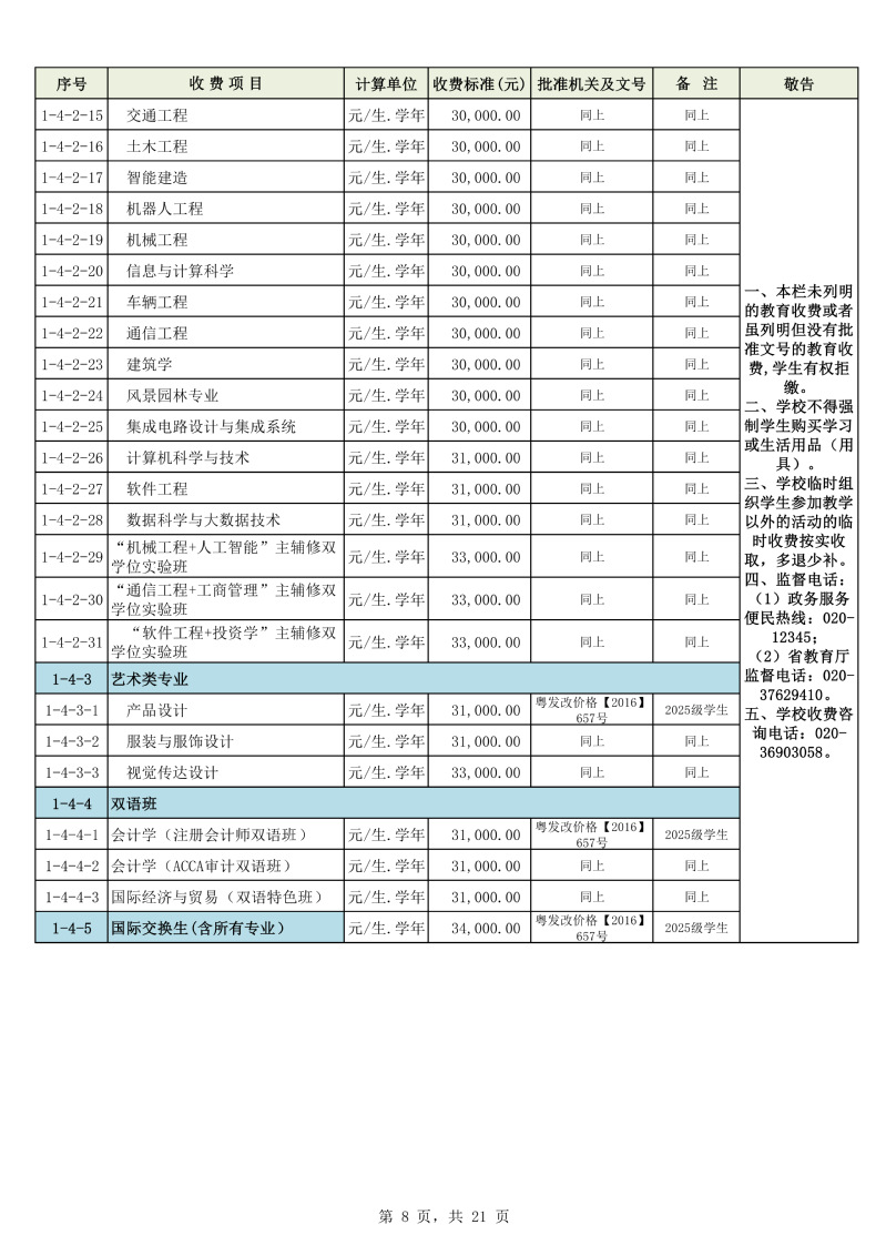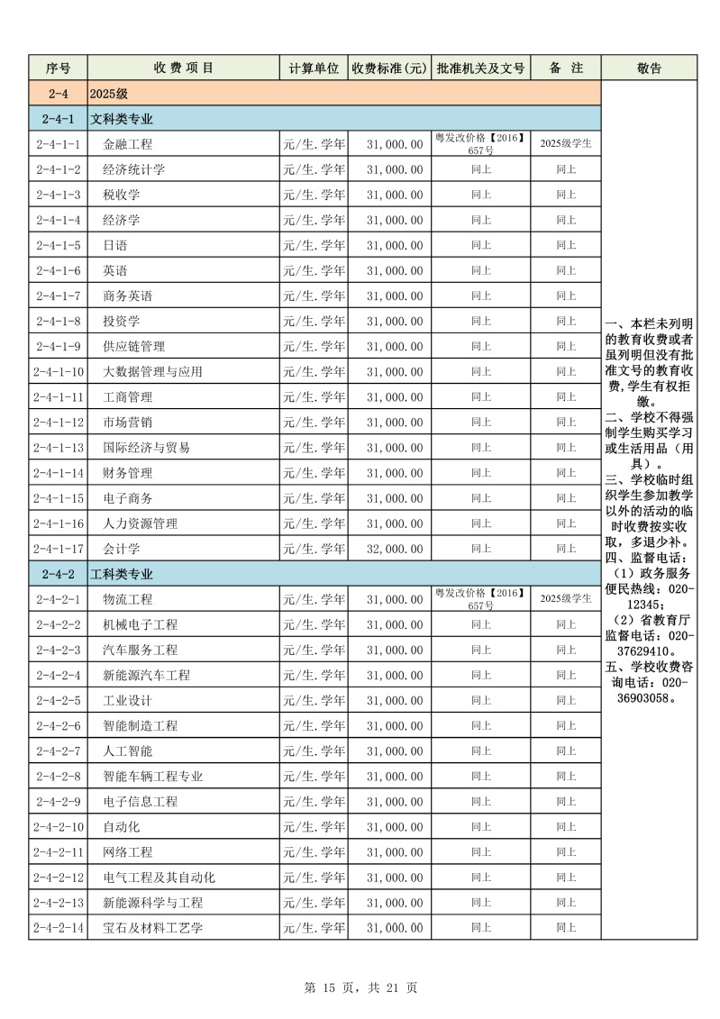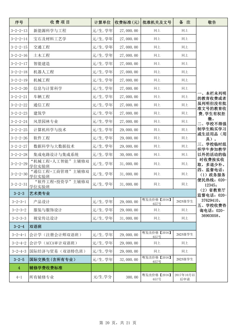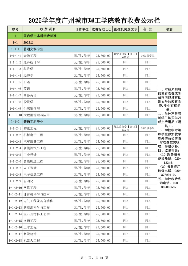 2025学年度广州城市理工学院教育收费公示栏