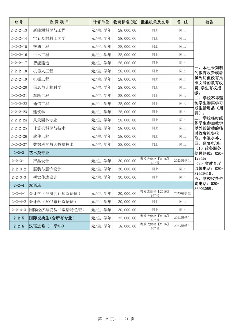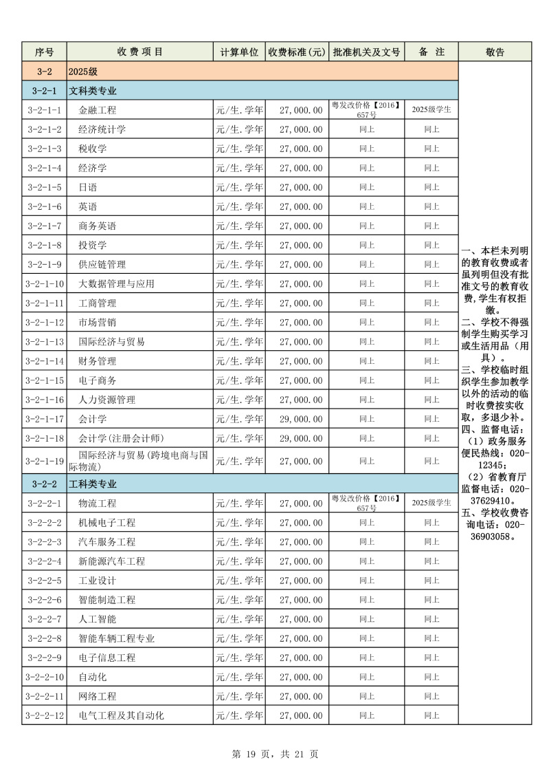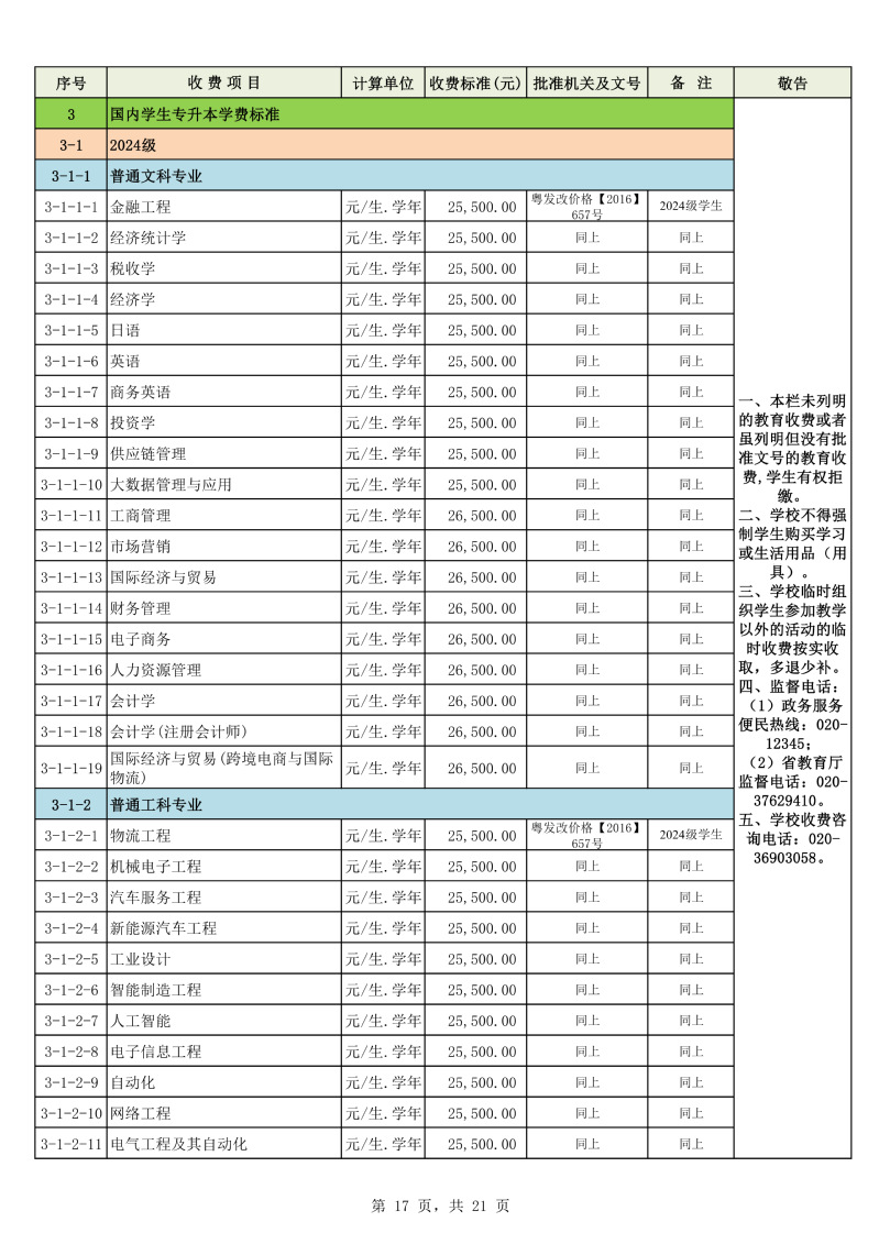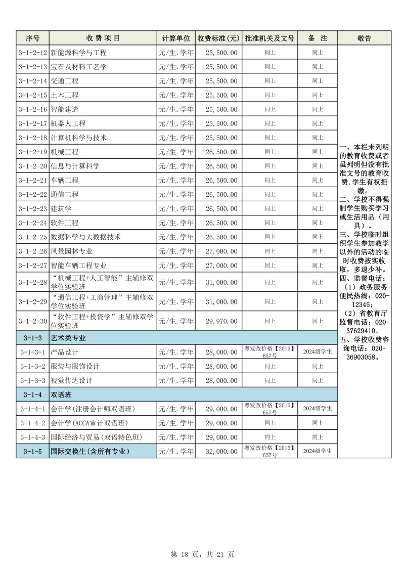 2025学年度广州城市理工学院教育收费公示栏
